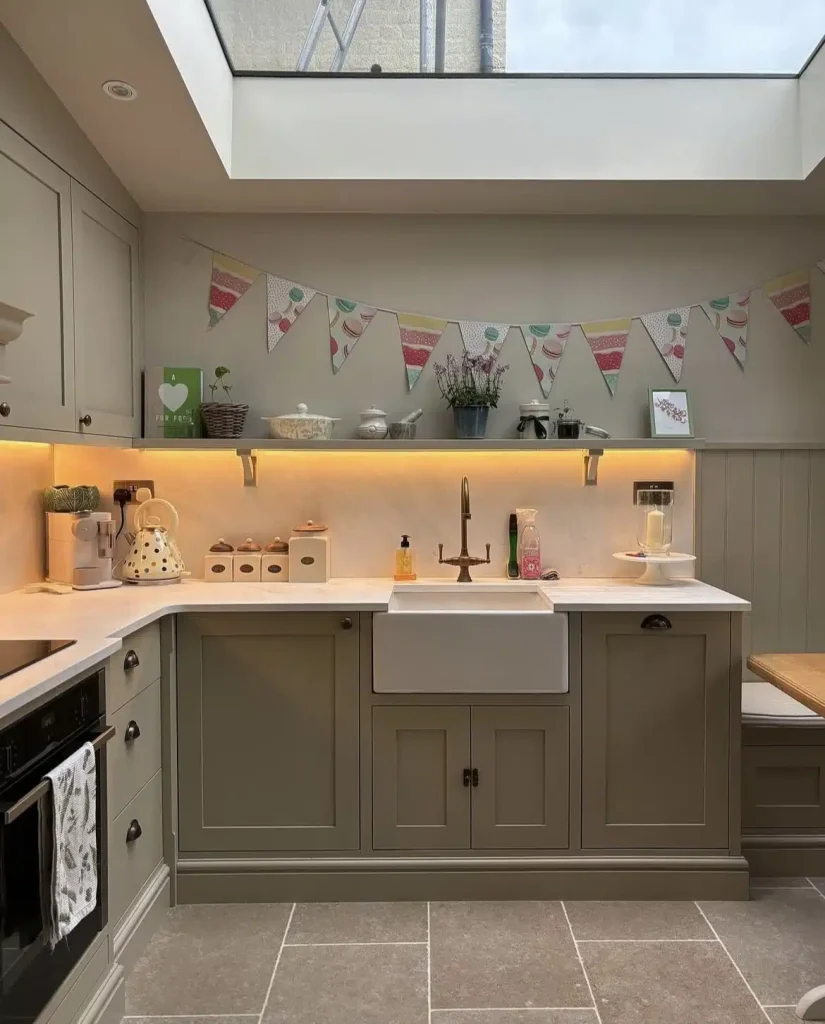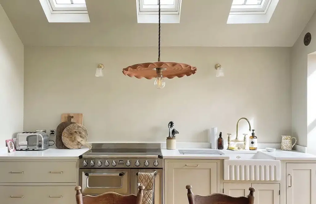 Colour drenching with Drop Cloth is always a good idea, and even more so if you have a sloped ceiling like the below kitchen does. When you paint a sloped ceiling like this in a different colour it has a habit of making a feature out of it instead, but for the wrong reason.