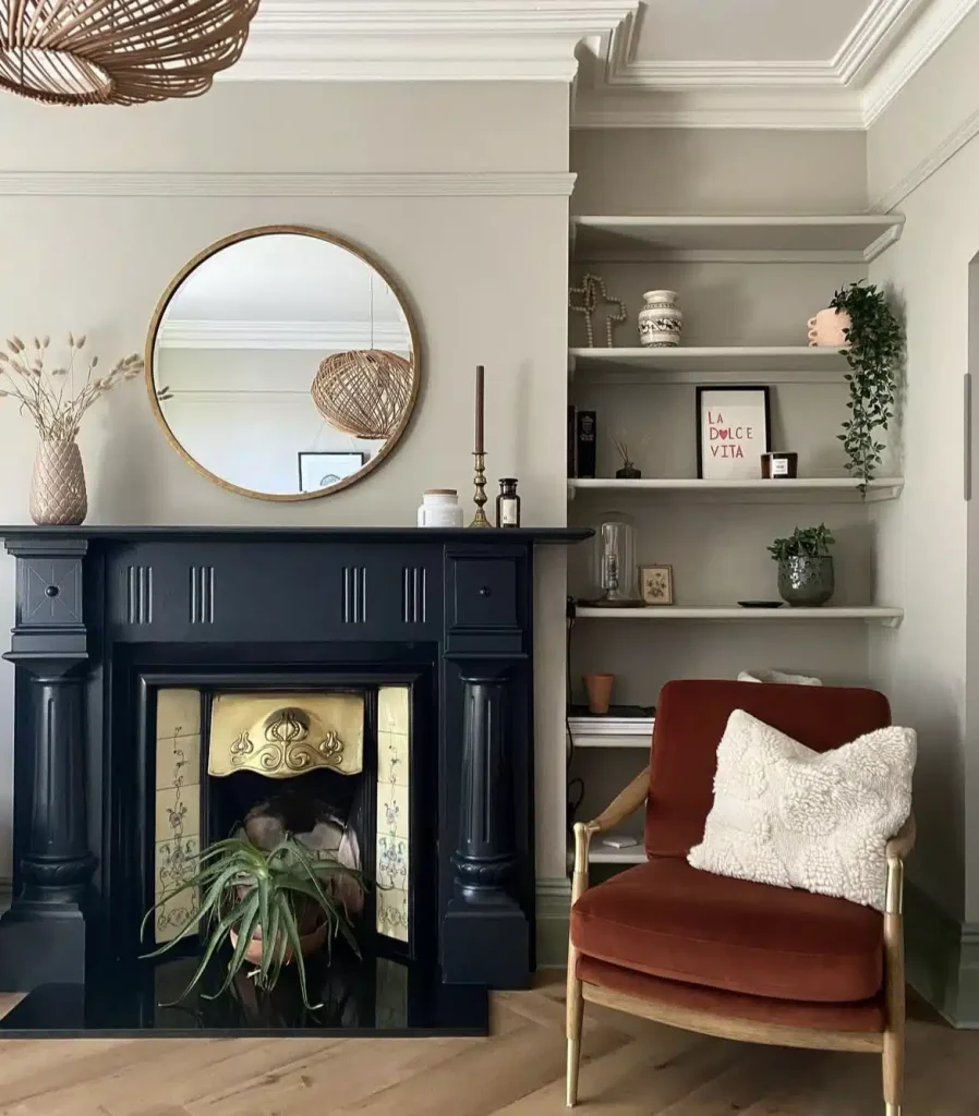 Pitch Black has been used on the fire surround here which is as pure as a black as you can get, and it does a wonderful job of grounding the Drop Cloth colour scheme.