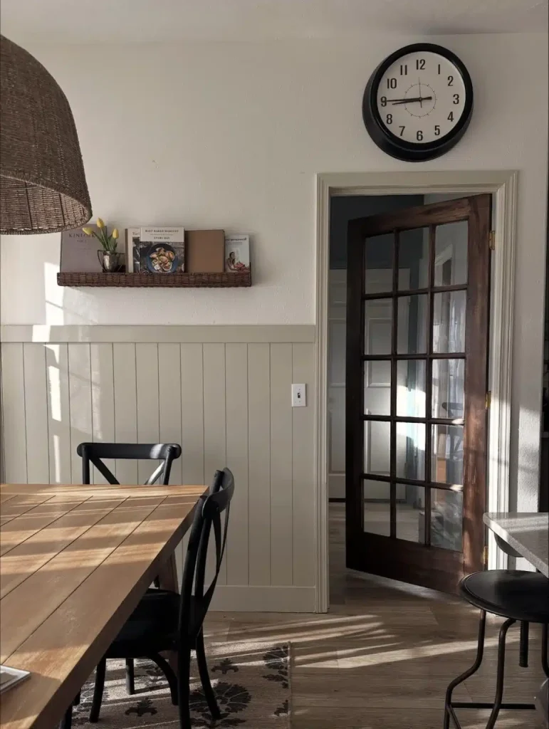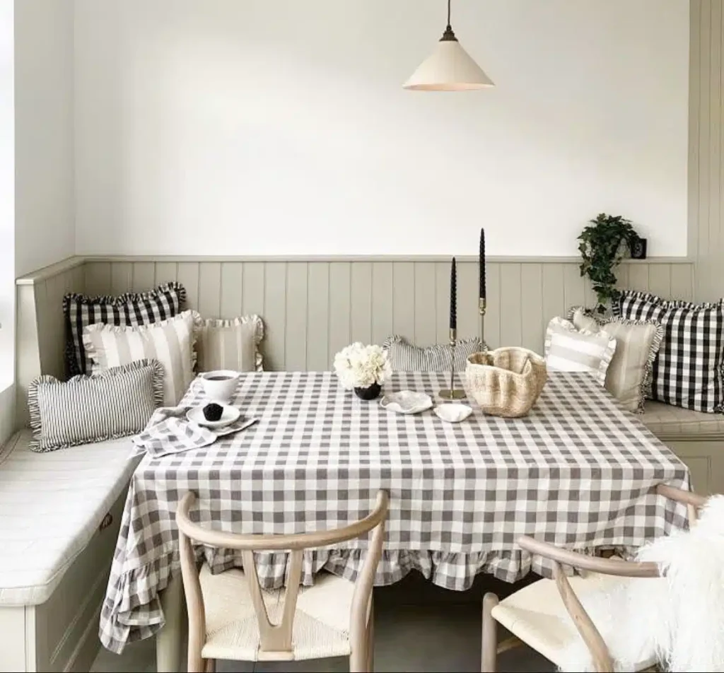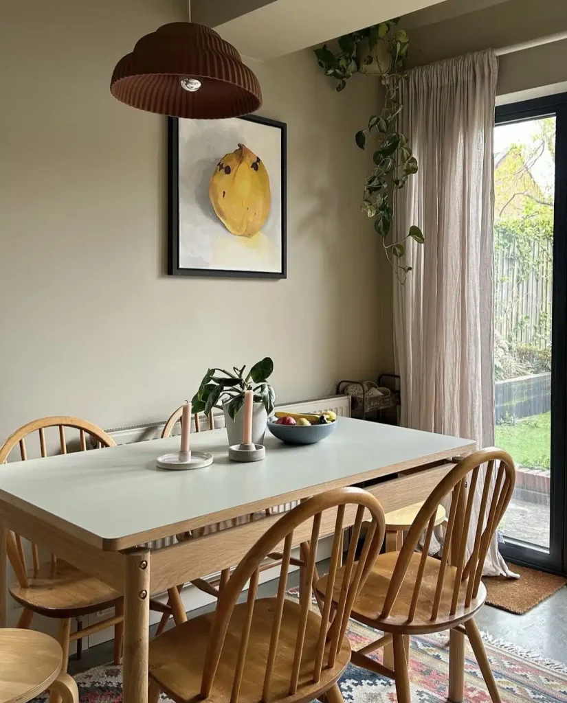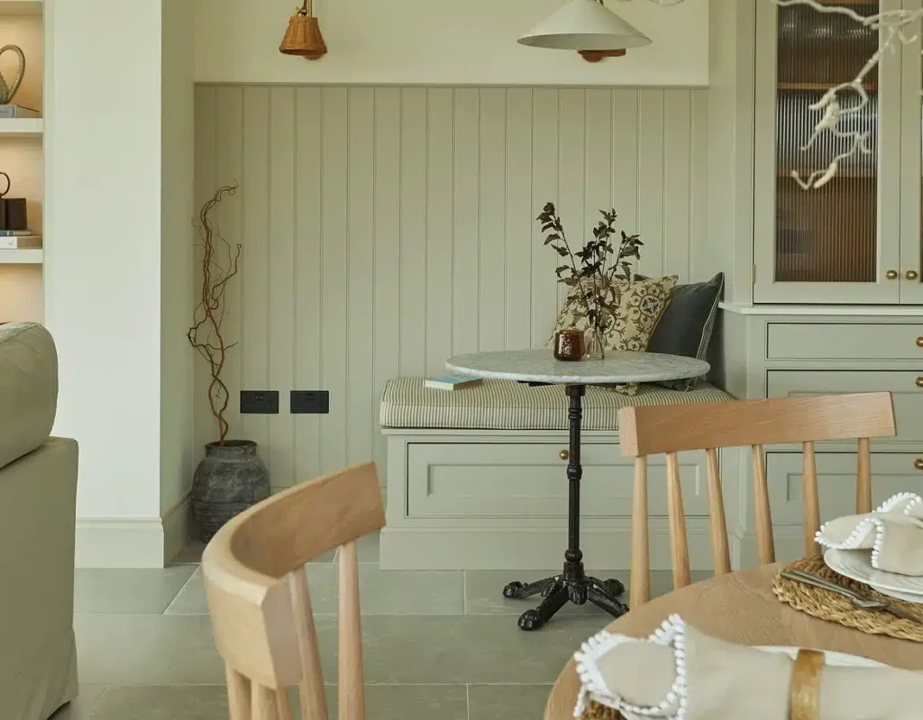This dining nook area looks so cosy and comfortable to be around, and I adore how Drop Cloth has been used on the panelling wrap around here to really define and set a zone in the space.