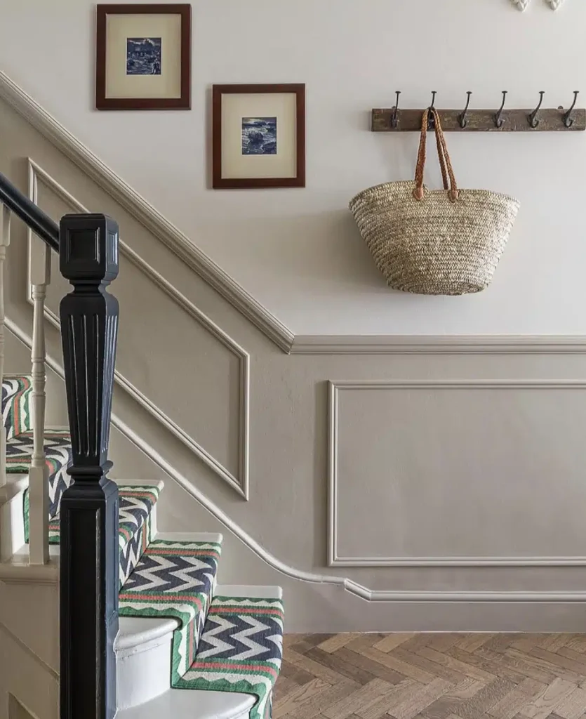 Take note from the below hallway space using Drop Cloth on the panelling, and can we talk about the fabulously audacious stair runner?!